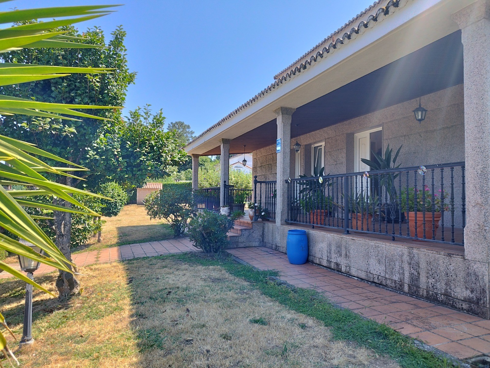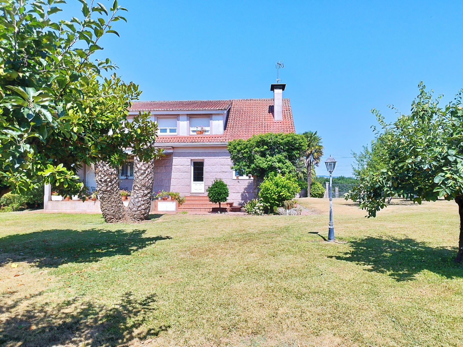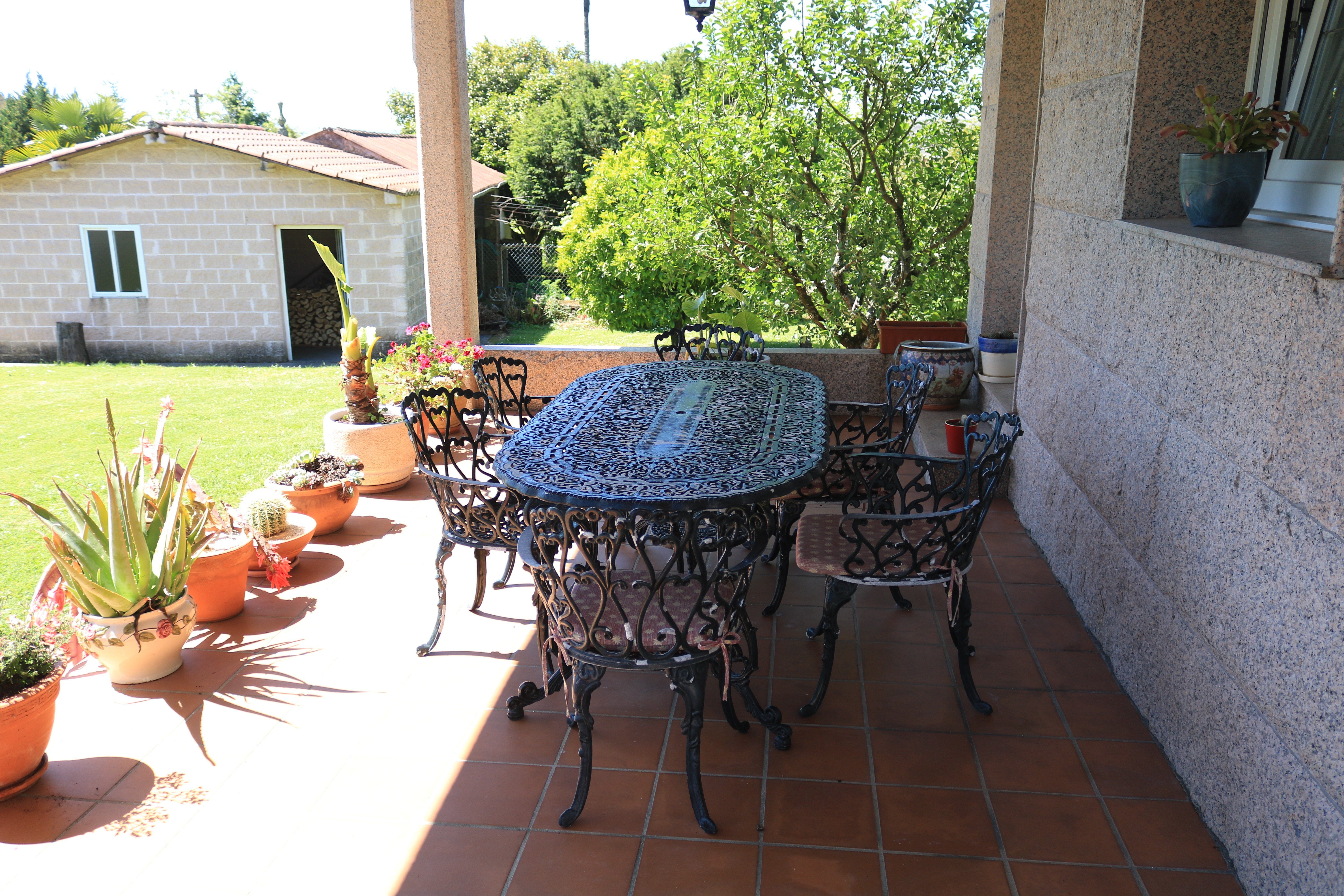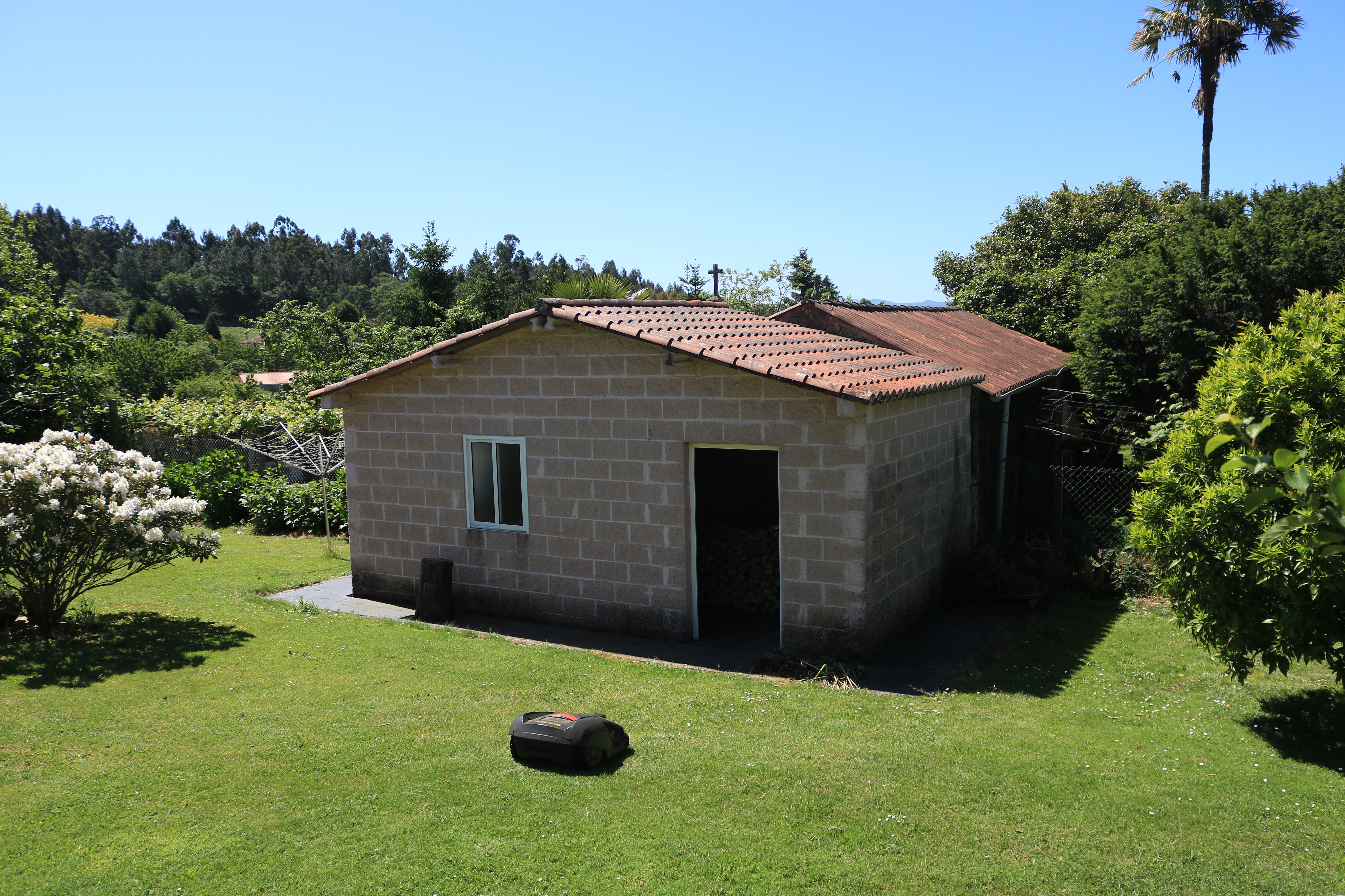 El jardín cuenta con árboles frutales (naranjos, manzanos, perales, limoneros, laurel, entre otros) y sistema de riego automático alimentado por un pozo propio de 42 m con un caudal de 13.000 L/h.