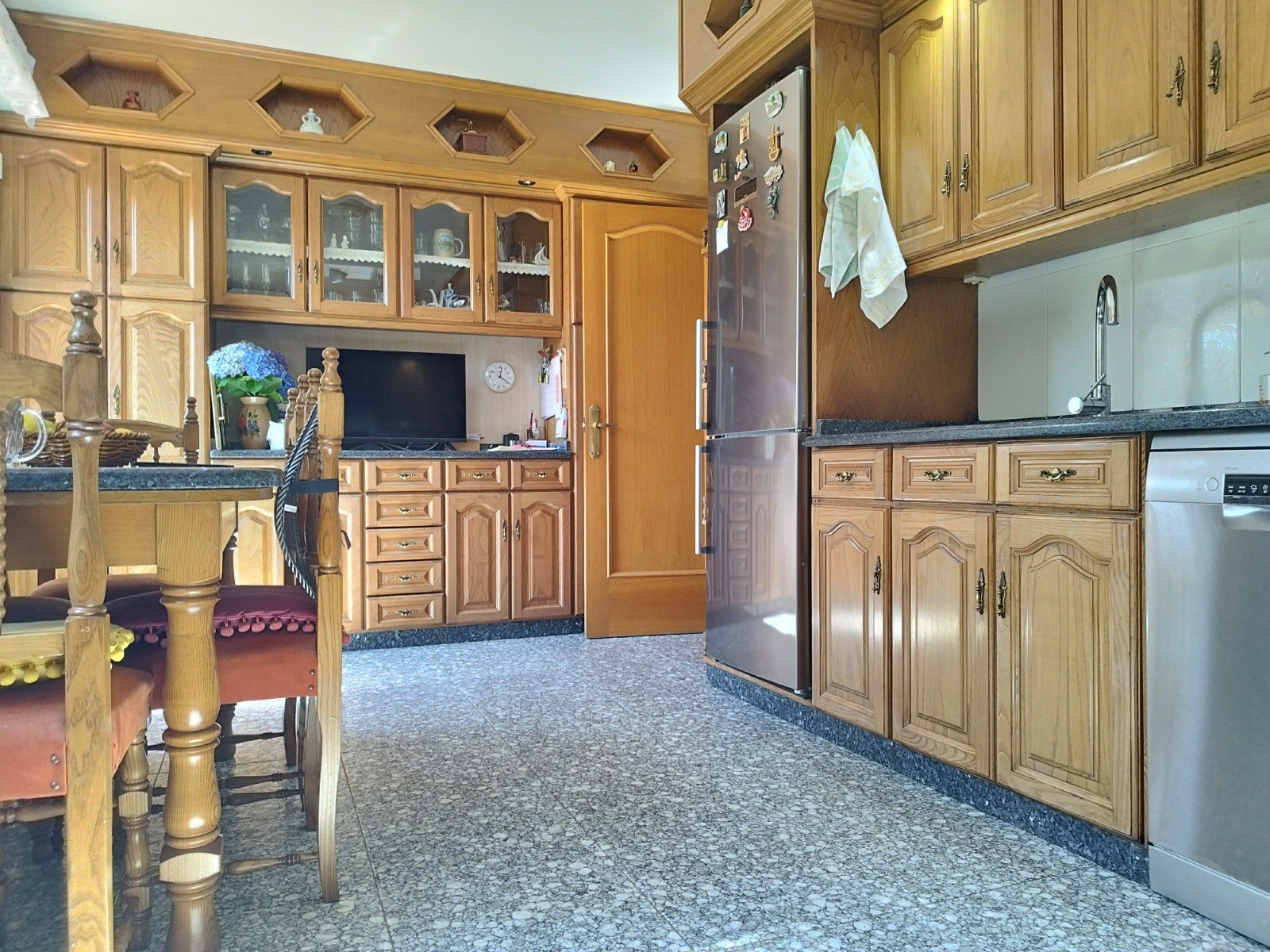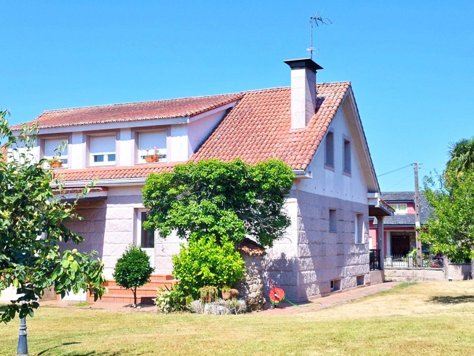 La vivienda, de 480 m² construidos, se distribuye en tres plantas y destaca por su sólida construcción y materiales nobles: paredes de granito rosado y ladrillo, puertas y rodapiés de roble, ventanas térmicas de PVC, cocina de castaño y suelos de parquet y baldosas de alta resistencia.